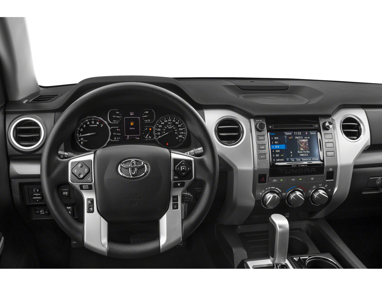This 2021 Toyota Tundra 4WD comes nicely equipped with 38 Gallon Fuel Tank Capacity, 4-Wheel Disc Brakes, 4.30 Axle Ratio, ABS brakes, Air Conditioning, AM/FM radio: SiriusXM, Anti-Theft Immobilizer w/Alarm, Apple CarPlay/Android Auto, Auto High-beam Headlights, Auto-Dimming Rear-View Mirror, Auto-dimming Rear-View mirror, Black Wheel Locks, Brake assist, Color-Keyed Power Heated Exterior Mirrors, Compass, Deck Rail System, Delay-off headlights, Driver door bin, Driver vanity mirror, Dual front impact airbags, Dual front side impact airbags, Electronic Stability Control, Emergency communication system: Safety Connect with 1-year trial, Exterior Parking Camera Rear, Front anti-roll bar, Front Bucket Seats, Front Door Smart Key System, Front fog lights, Front reading lights, Front wheel independent suspension, Fully automatic headlights, Garage door transmitter: HomeLink, Heated door mirrors, HomeLink Universal Transceiver, Illuminated entry, Knee airbag, Low tire pressure warning, Occupant sensing airbag, Outside temperature display, Overhead airbag, Overhead console, Panic alarm, Passenger door bin, Passenger vanity mirror, Power door mirrors, Power steering, Power windows, Push Button Starting System, Radio data system, Rear reading lights, Rear seat center armrest, Rear step bumper, Rear window defroster, Remote Connect, Remote keyless entry, Safety Connect, Service Connect, SiriusXM Radio, Speed control, Speed-sensing steering, Split folding rear seat, Steering wheel mounted audio controls, Tachometer, Tilt steering wheel, Traction control, Trip computer, Variably intermittent wipers, and Voltmeter.